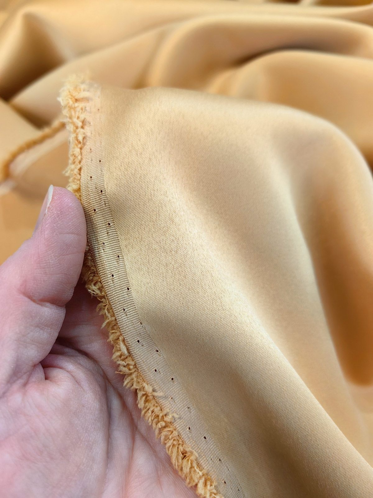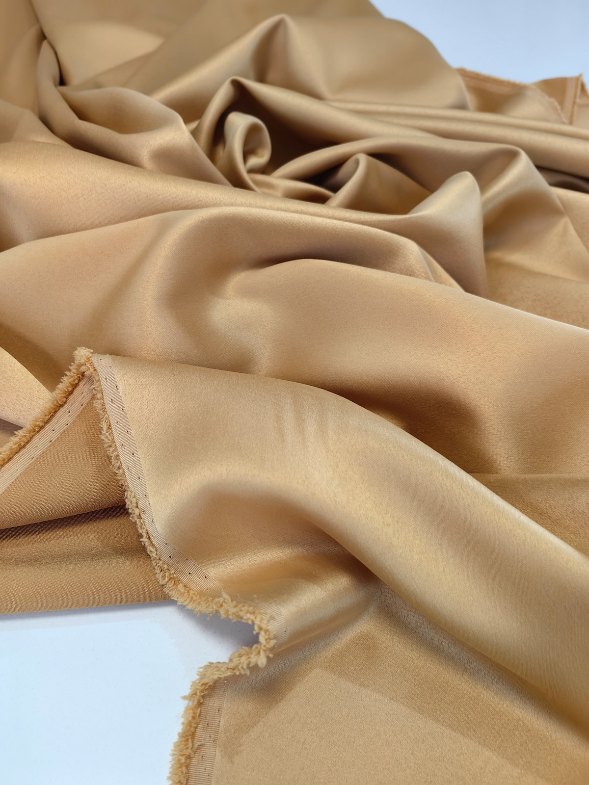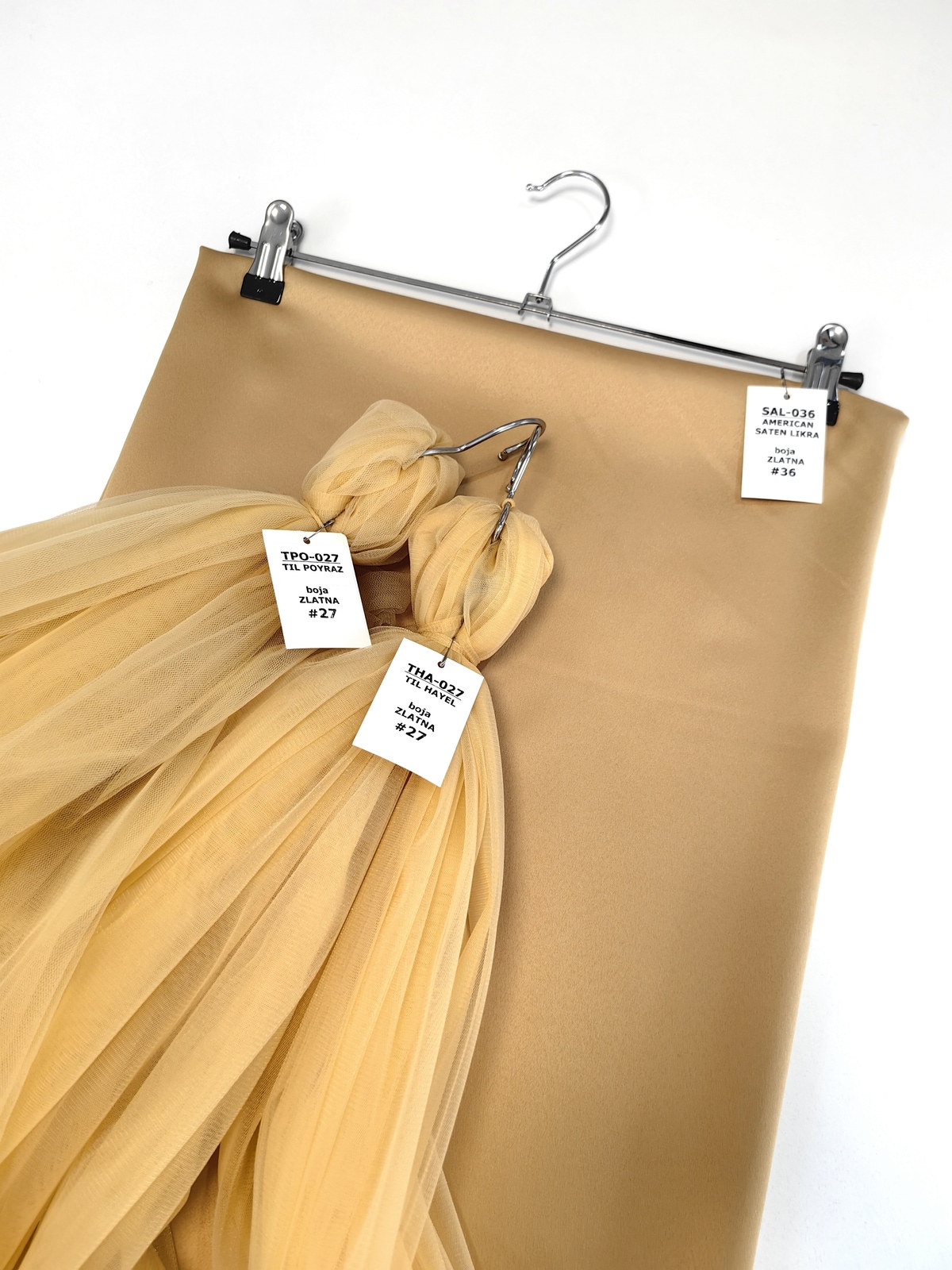 Američki saten likra boja Zlatna lepo pada, lepo drapira, ima mat površinu, nije gust. Ovaj saten ima u sastavu i 97% polijestera 3% likre. Zbog toga dobro se rasteže u jednom pravcu.