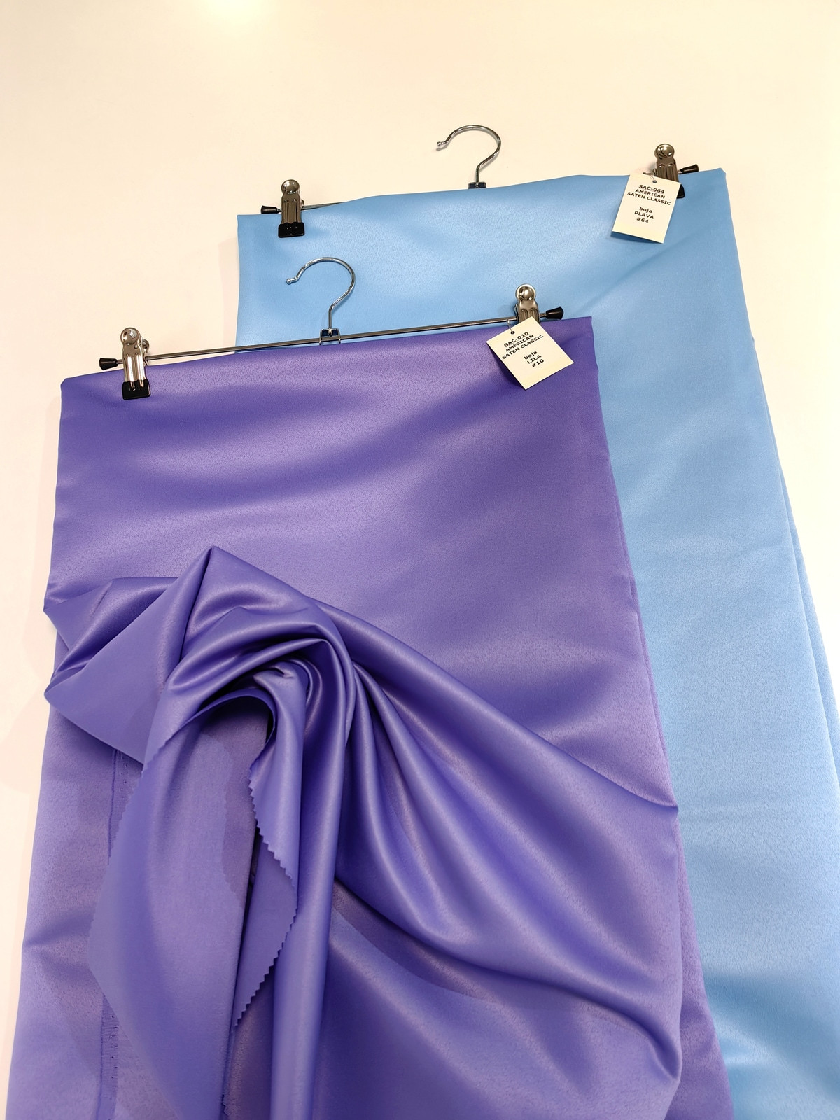 Američki saten klasični boja Lila ili Mat saten je čvrst saten sa mat površinom u čijem sastavu nema likre. Koristi se za šivenje svečanih haljina, maturskih haljina, dečjih haljina i raznih aksesoara koji moraju da drže oblik. Na primer, za mašne.