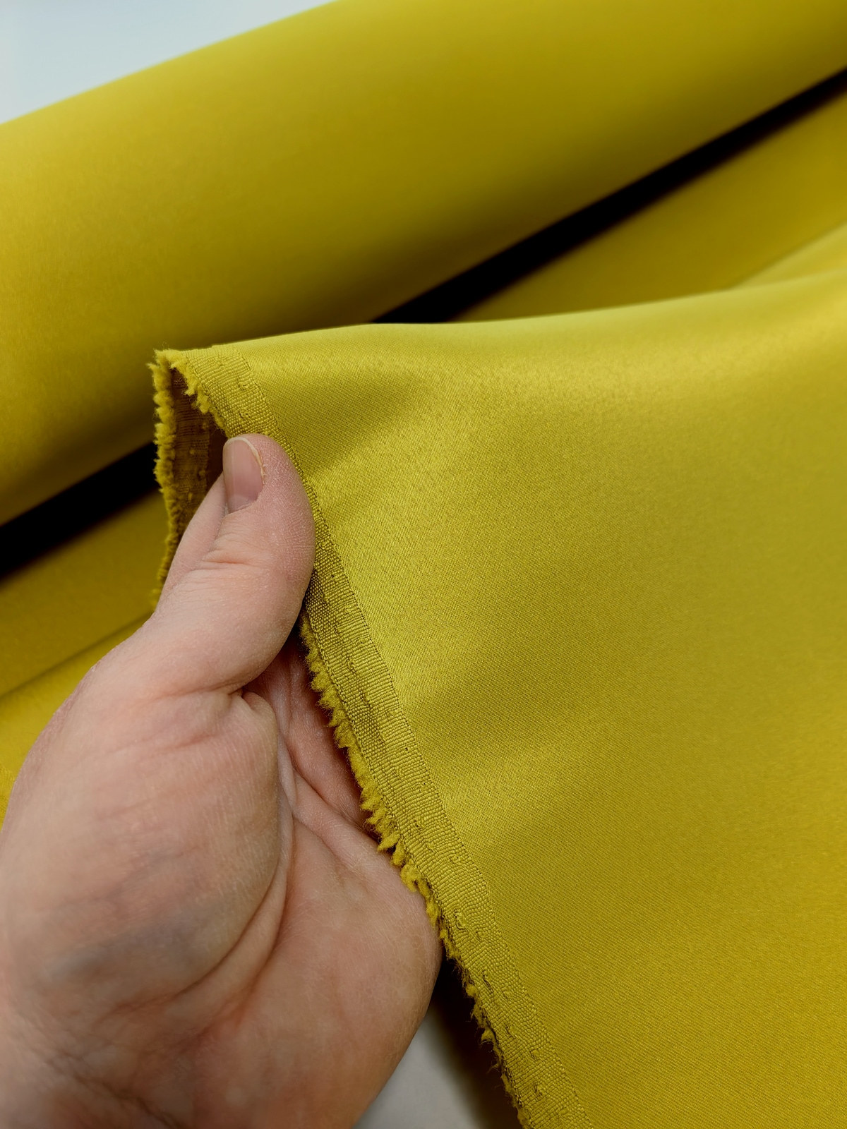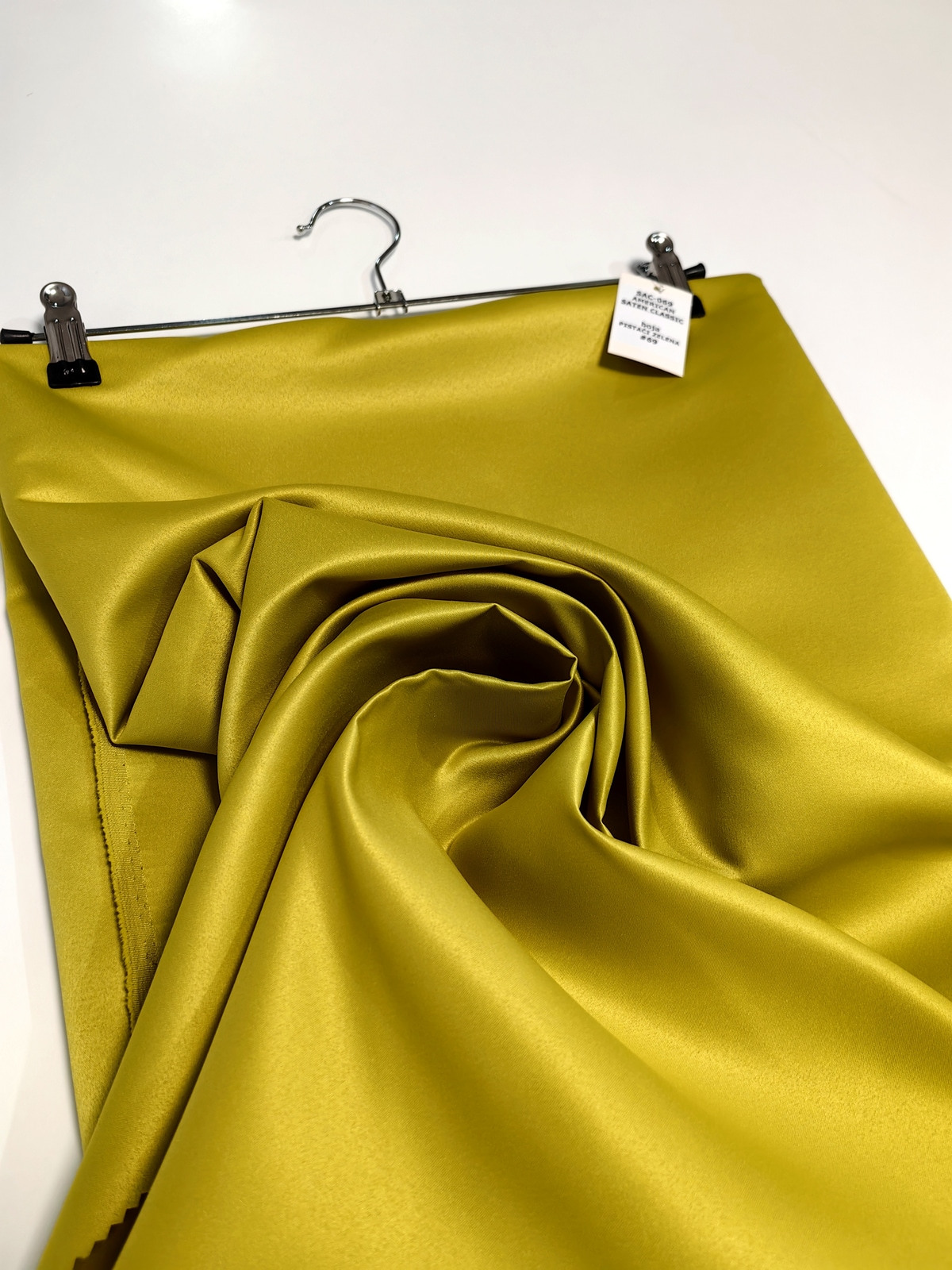 Američki saten klasični boja Pistaći Zelena ili Mat saten savršeno drži oblik, ima mat površinu, koju karakteriše visoka otpornost na habanje. Ovaj saten je gust, stabilan u obliku, ne sadrži likru, zbog čega se ne rasteže. Ne prosijava se. Nije skup. Koristi se u šivenju proizvoda koji zahtevaju zadržavanje oblika.