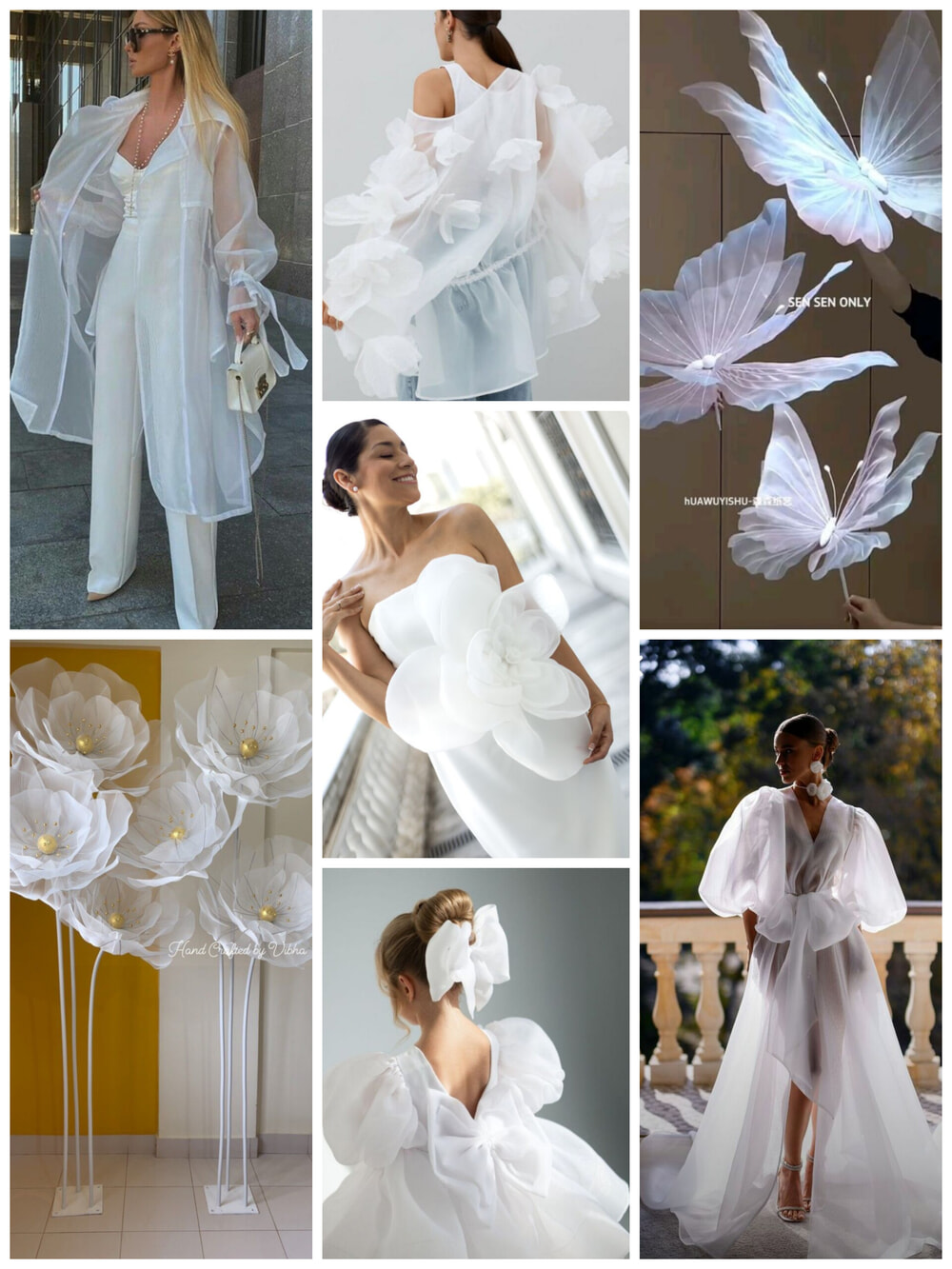 Organdin Karolin boja Prva do Bele pogodan je za kreiranje luxuznih modela. Lagan ali ima čvrstinu što ga čini idealnim za postizanje volumena i skulpturalnih formi koje drže oblik, naprimer za puf-rukave ili ruže. Dobar je za venćanica, haljina, bluza, aksesoare u obliku cveća (broševi, venci za glavu, pojas i tako dalje), za dečji svečane haljine i drugo. Odličan je za izgradu dekorativnih cveća i leptira za dekoraciju zale za proslave.
