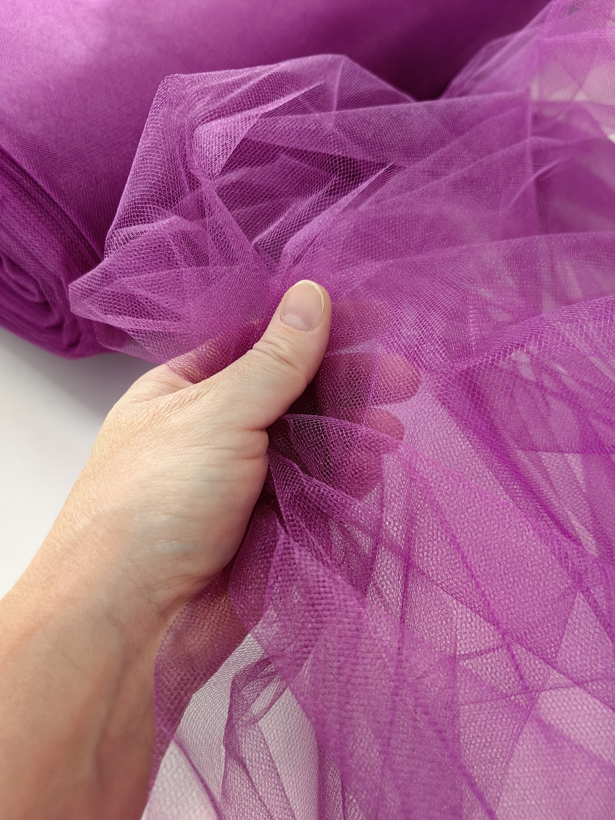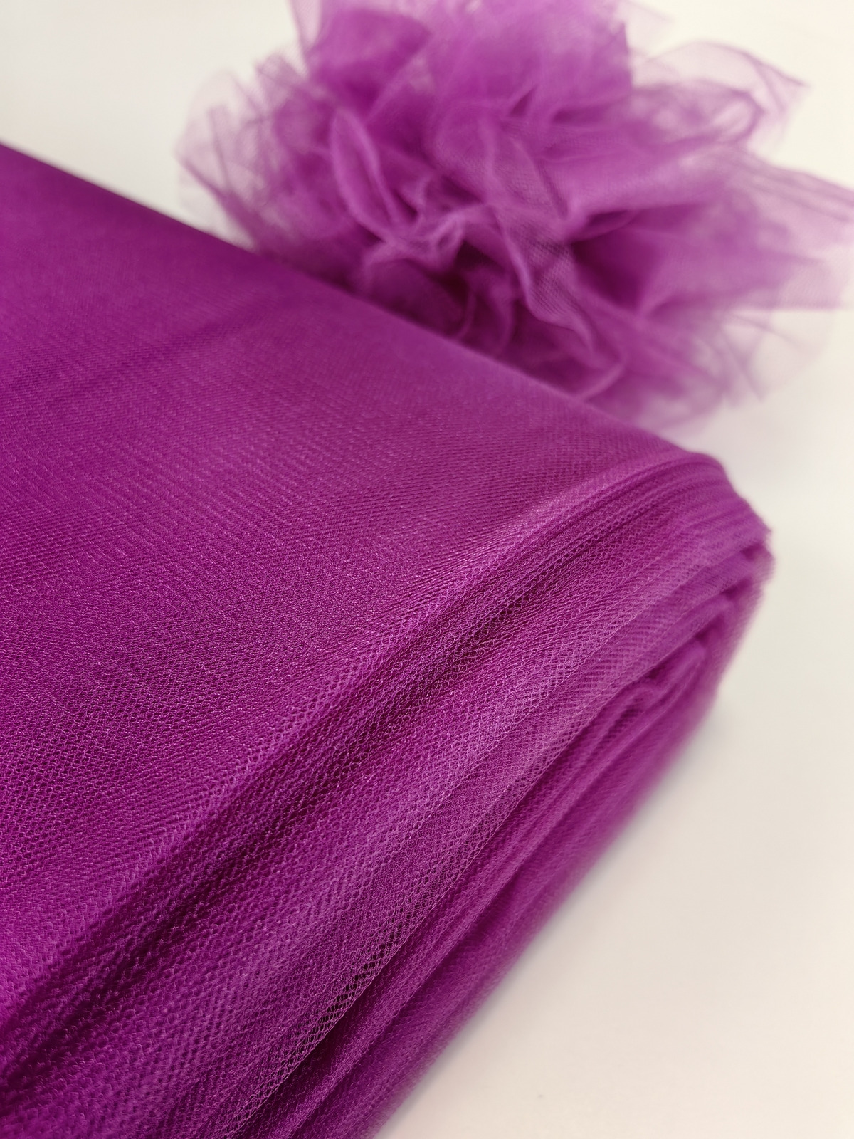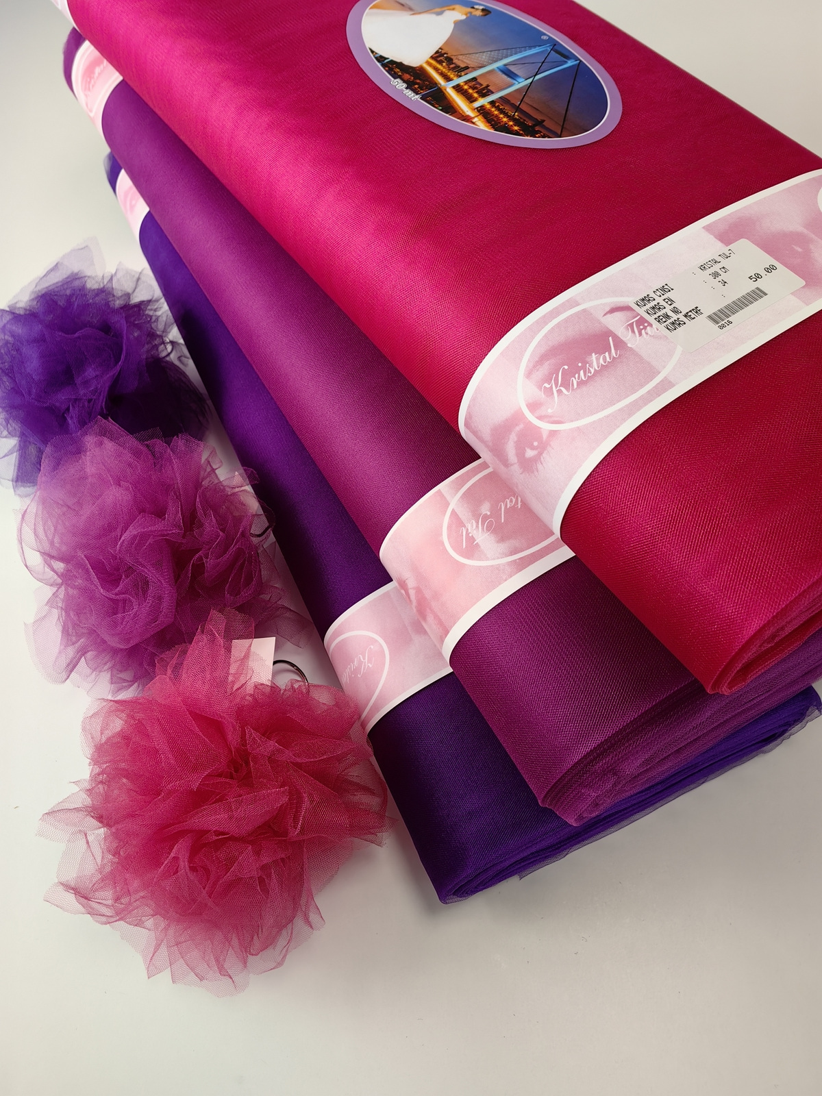 Til Kristal boja Ciclamen upadljiv, privlačan, sa primetnim kristalnim sjajem. Savršeno drži oblik, nje skup. Najviše se koristi za dekor venčanja, proslava i automobila, za kostime, maskenbal, baletske pačke. Takođe se koristi za donje suknje ispod teških tkanina.