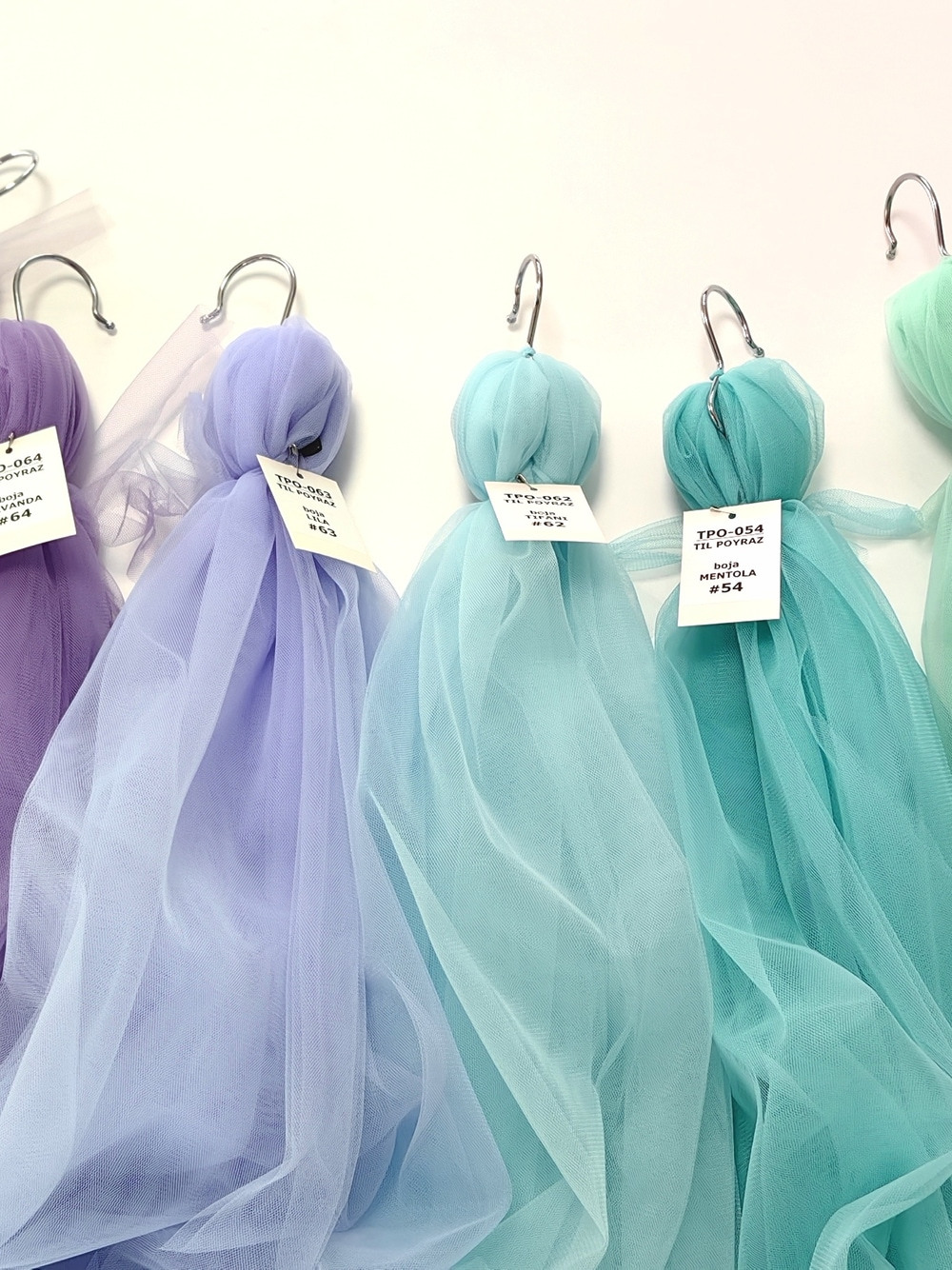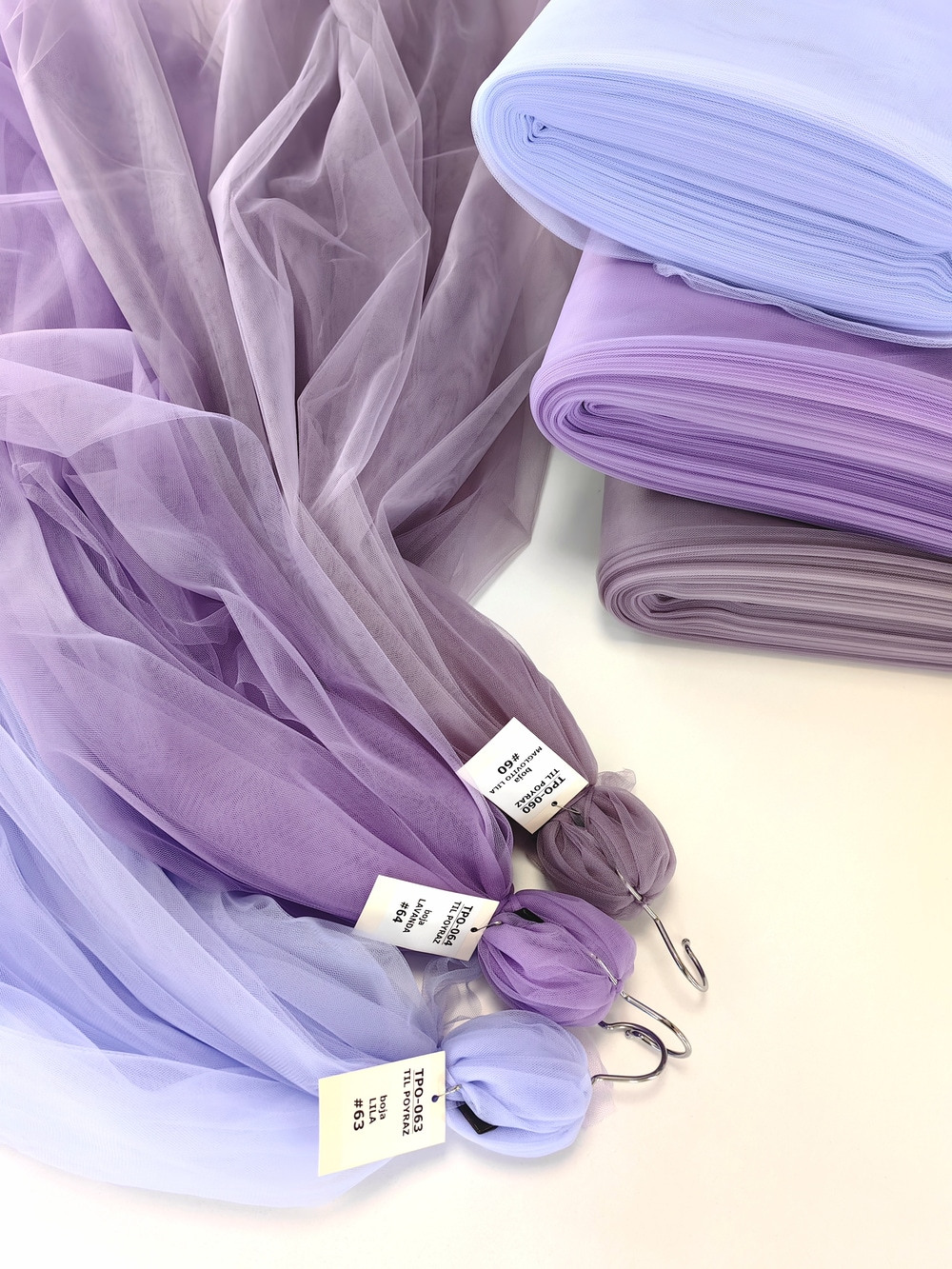 Til Poyraz boja Lila je lagan, lepršav, providan, mat, nje skup. Na raspolaganju je široka paleta boja. Koristi se za dekor svadbe i proslava, kućni dekor, baldahine, haljine, suknje, kostime etc.