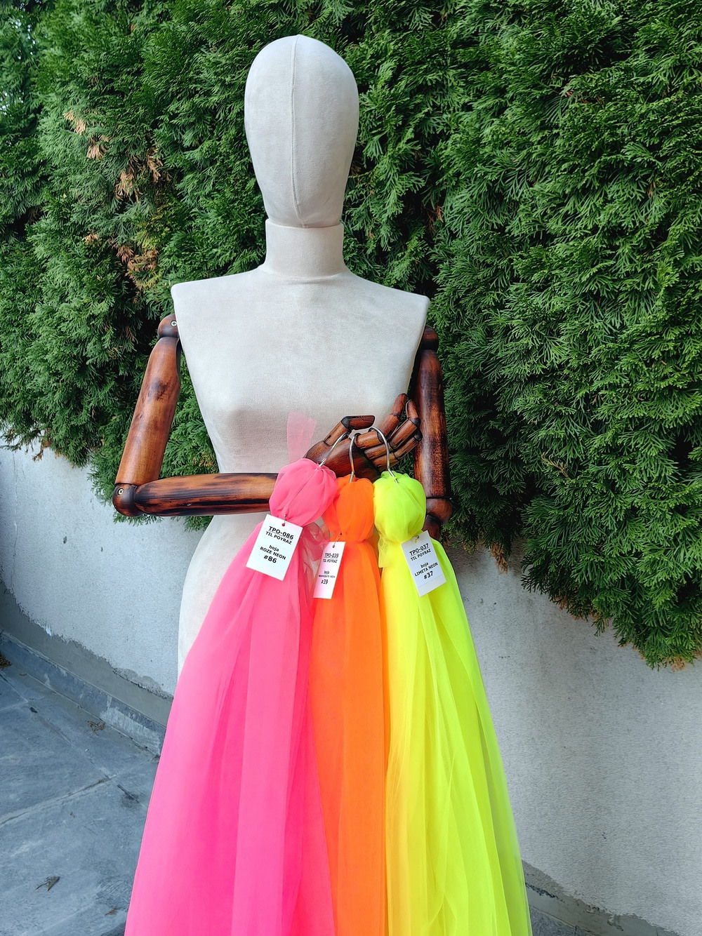 Til Poyraz boja Narandžasta Neon je lagan, lepršav, providan, mat, nje skup. Na raspolaganju je široka paleta boja. Koristi se za dekor svadbe i proslava, kućni dekor, baldahine, haljine, suknje, kostime etc.
