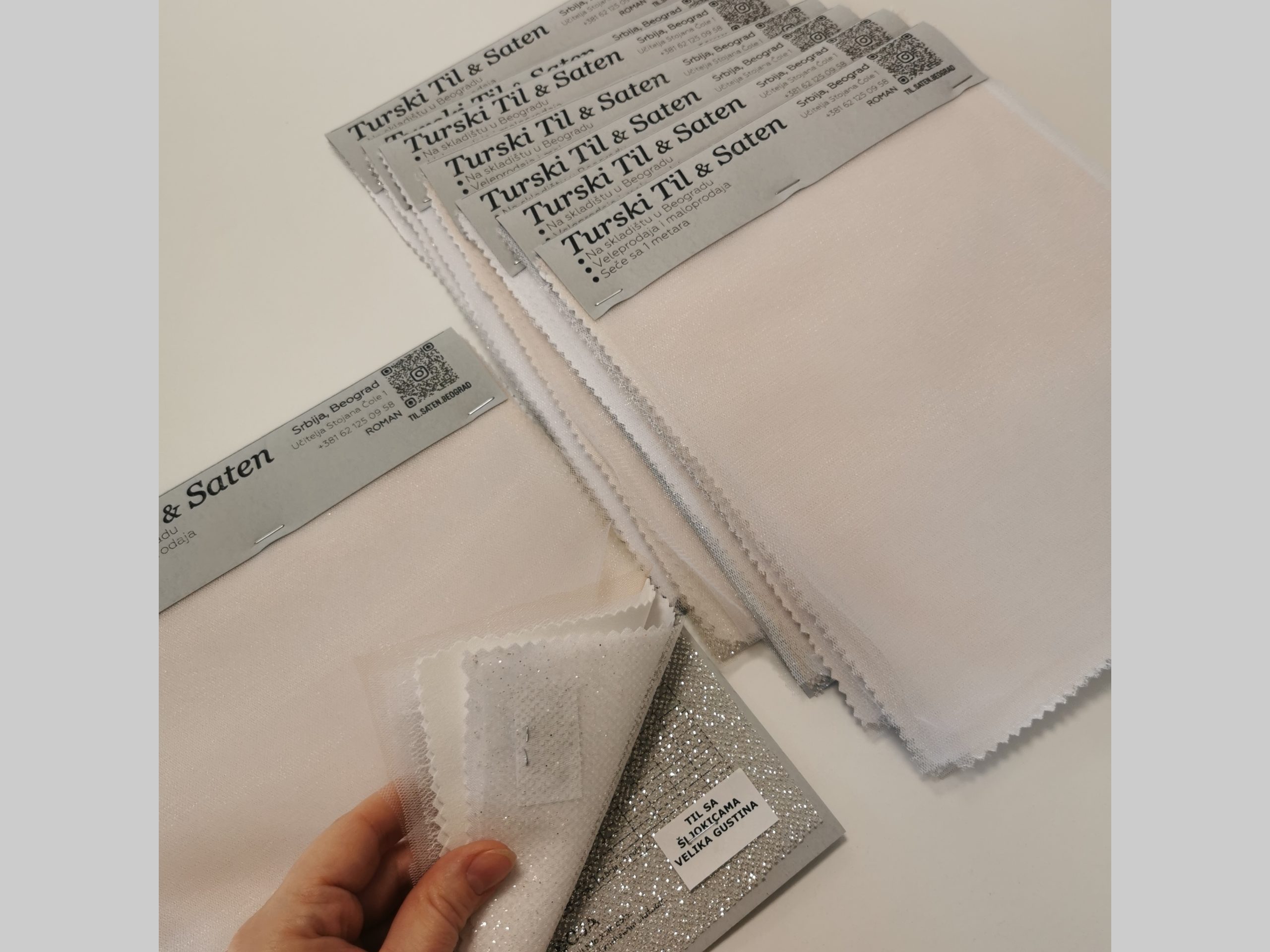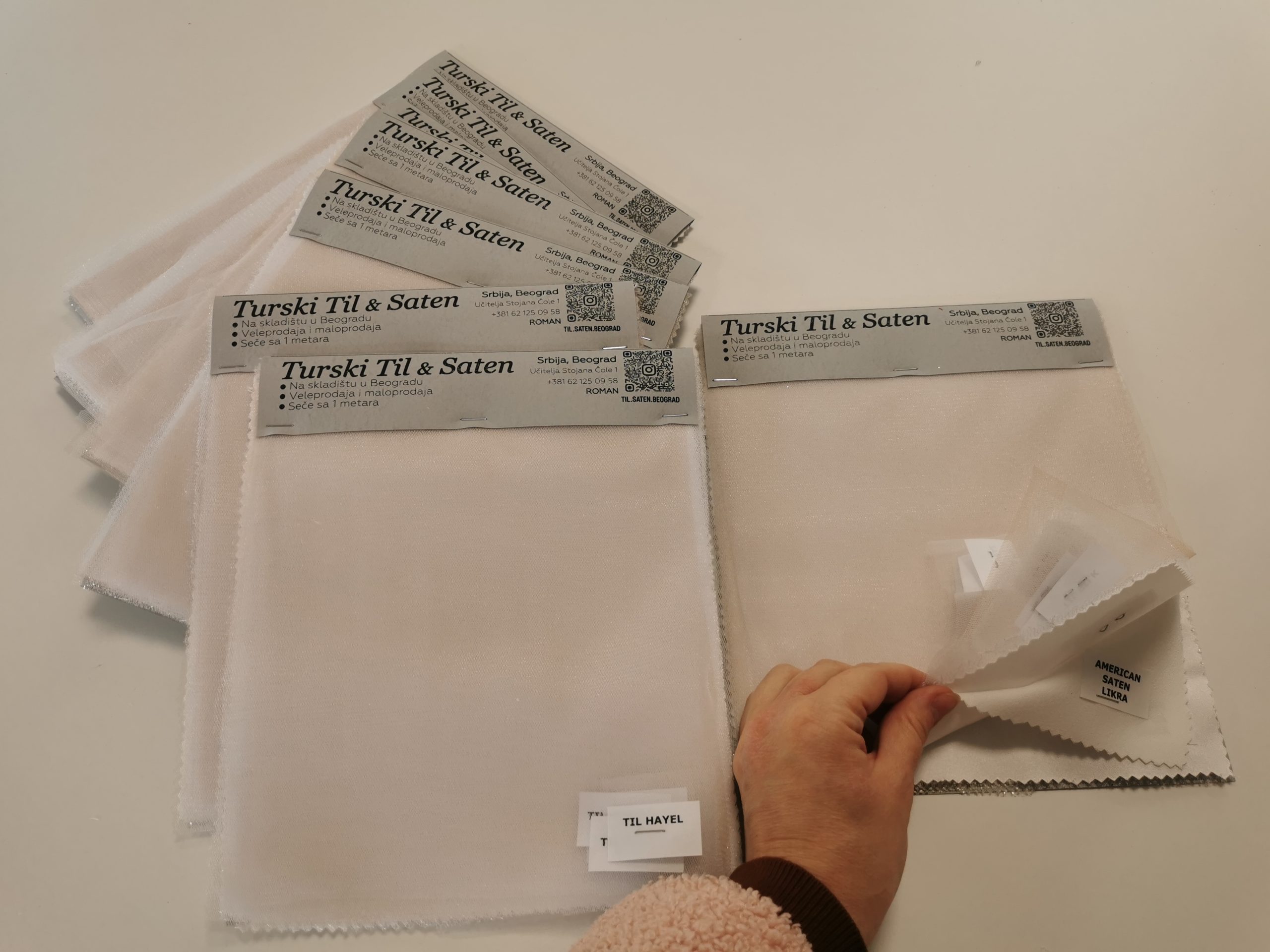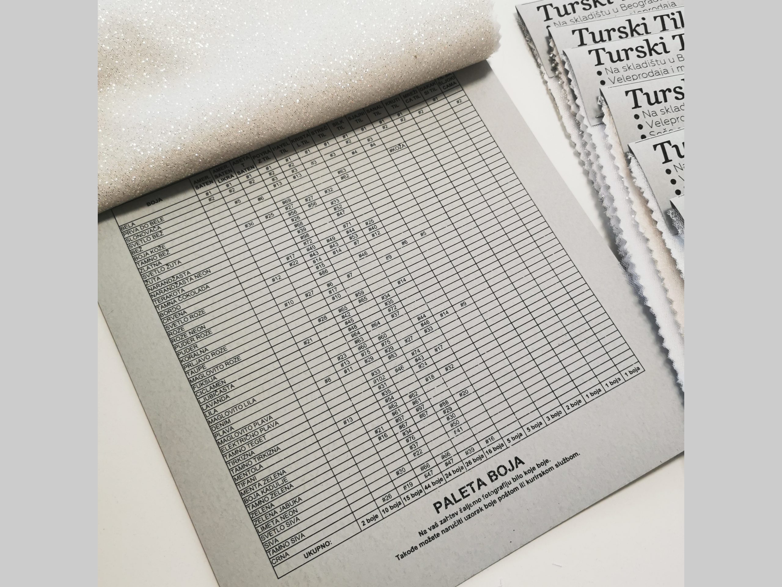Uzorci Naša prodavnica tkanina može poslati uzorke. Uzorak tkanine je katalog koji sadrži sve tkanine tkanine u 1 boji. Katalog tkanina uključuje i paletu boja u obliku tabele, koja pokazuje u kojim bojama je svaka tkanina dostupna.